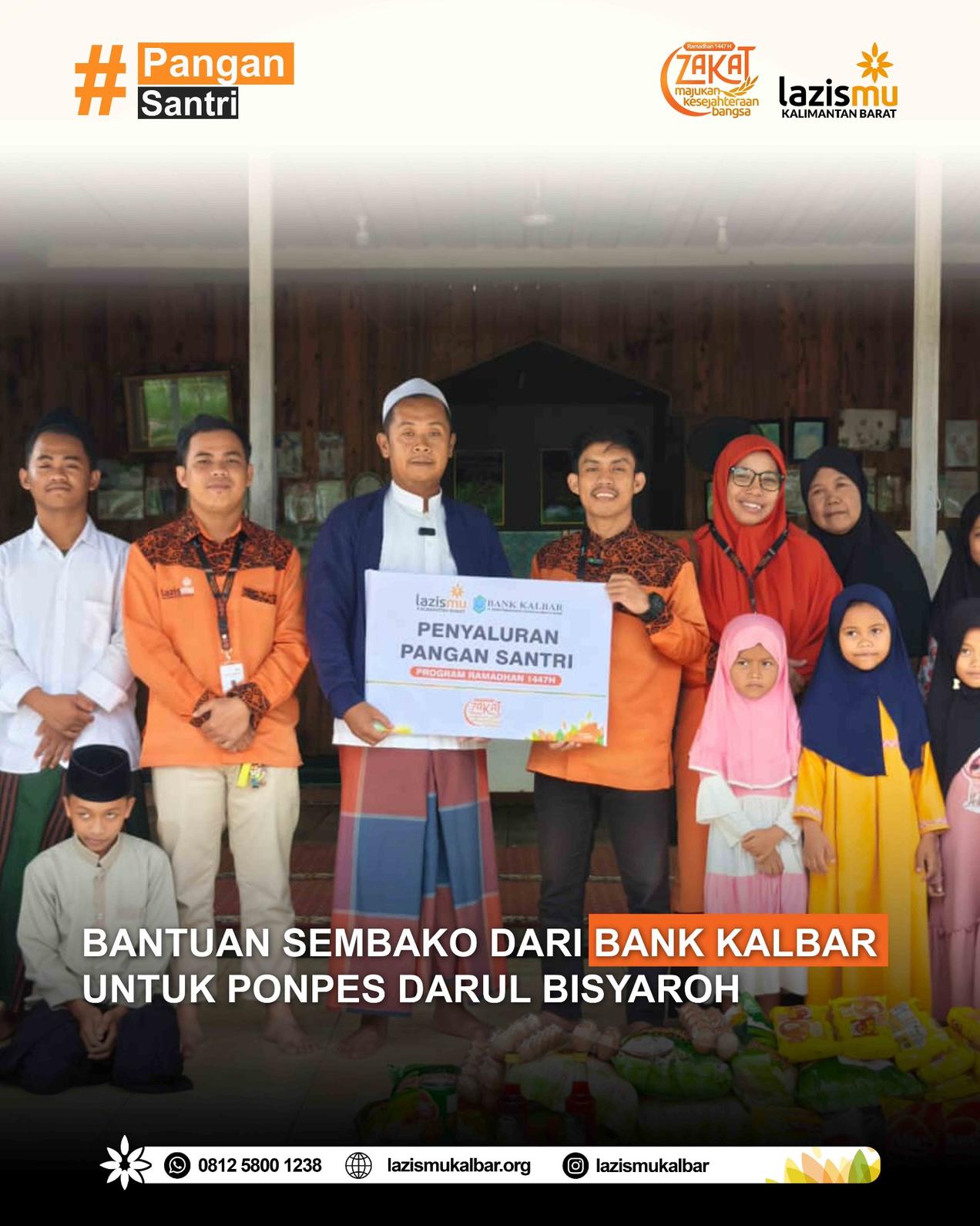 Pontianak — Senin, 9 Maret 2026. Lazismu Kalimantan Barat menyalurkan bantuan paket sembako dari Bank Kalbar kepada para santri di Pondok Pesantren Darul Bisyaroh sebagai bentuk kepedulian terhadap kebutuhan pangan di lingkungan pesantren.
