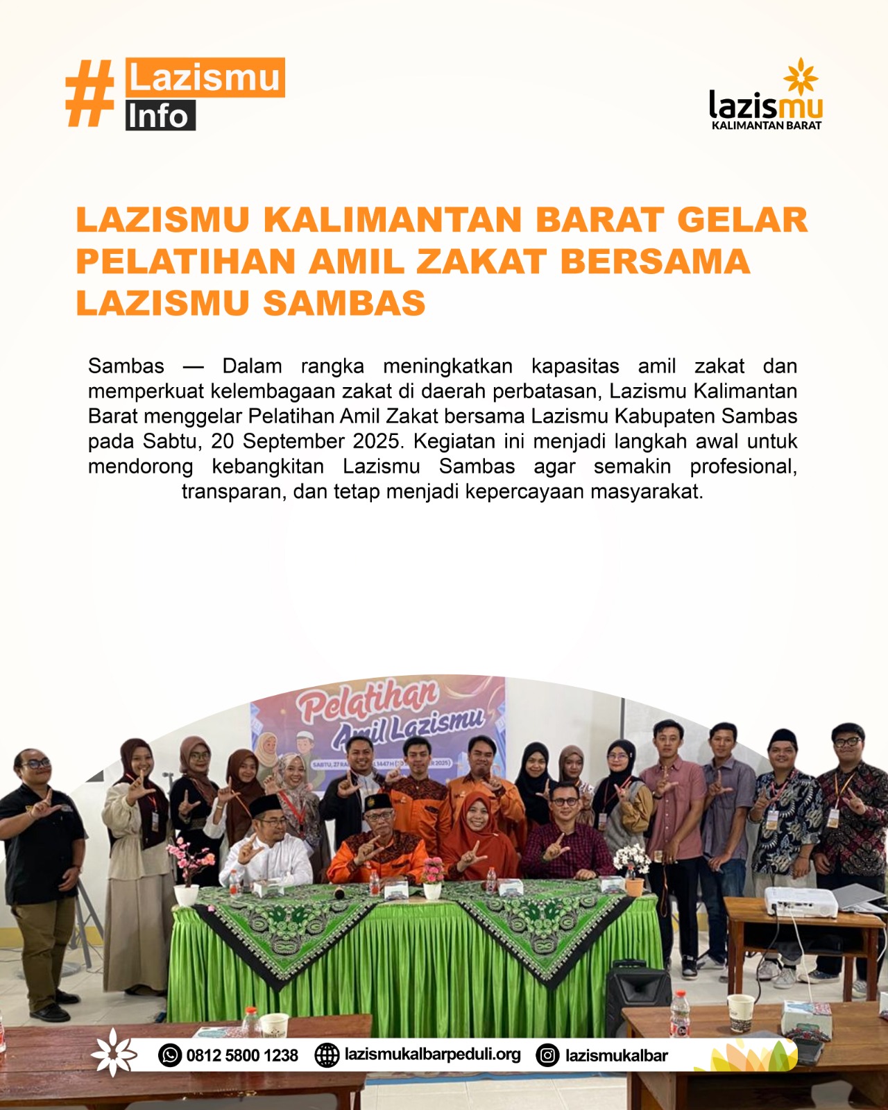 Sambas — Dalam rangka meningkatkan kapasitas amil zakat dan memperkuat kelembagaan zakat di daerah perbatasan, Lazismu Kalimantan Barat menggelar Pelatihan Amil Zakat bersama Lazismu Kabupaten Sambas pada Jumat, 19 September 2025. Kegiatan ini menjadi langkah awal untuk mendorong kebangkitan Lazismu Sambas agar semakin profesional, transparan, dan tetap menjadi kepercayaan masyarakat.